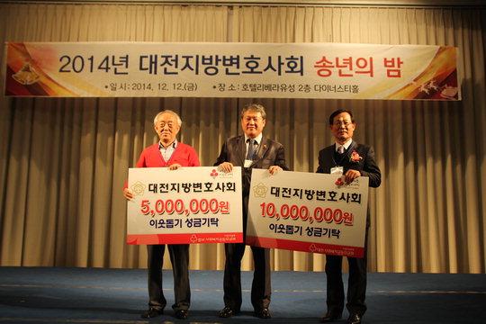 대전지방변호사회는 지난 12일 2014년 송년의 밤 행사에서 이웃돕기 성금으로 대전공동모금회에 1000만원, 충남공동모금회에 500만원 등 총 1500만원을 전달했다. 이관형 충남공동모금회장과 문성식 대전지방변호사회장, 안기호 대전사회복지공동모금회장(왼쪽부터)이 기념촬영을 하고 있다.